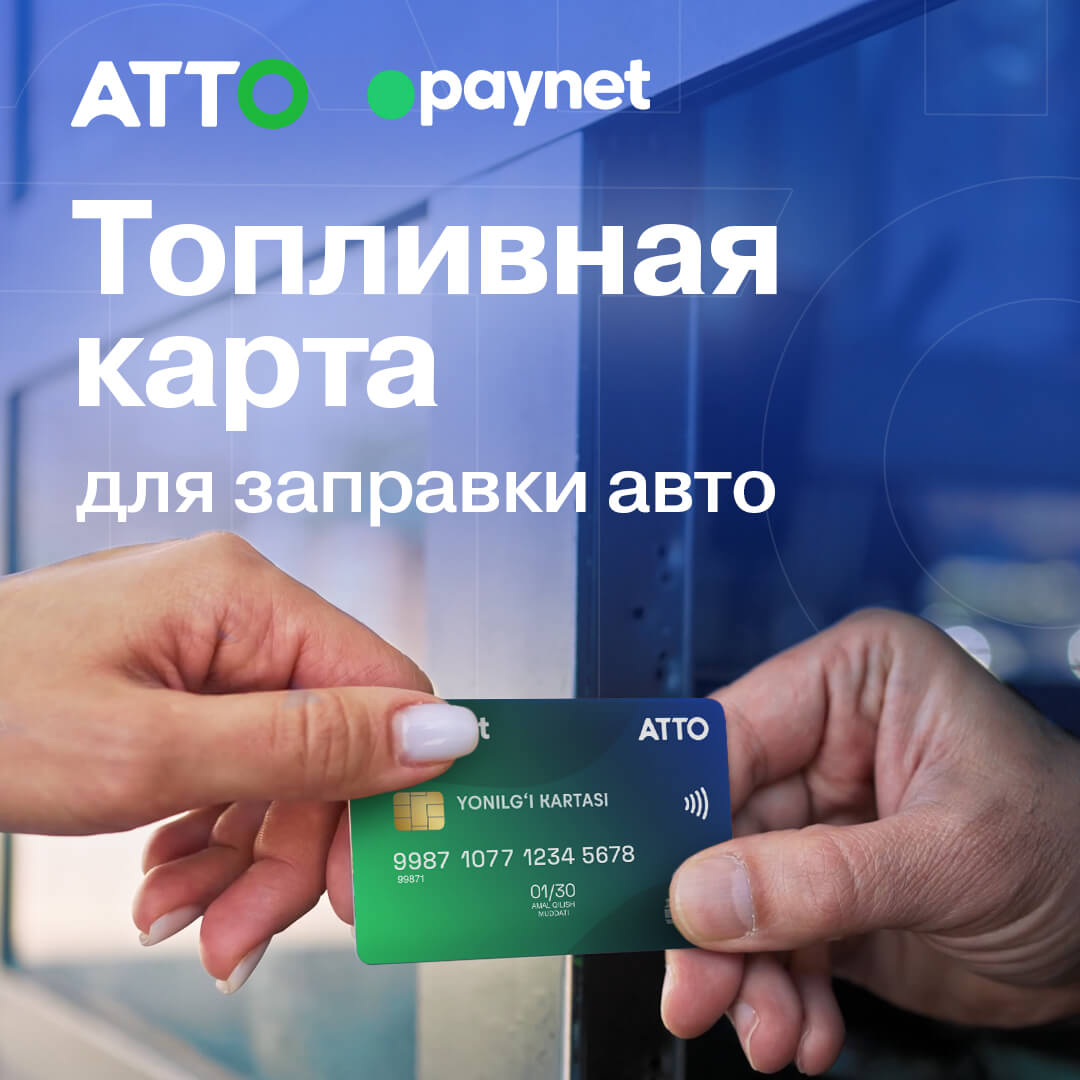 Prezidentning 10.12.2025-yildagi PF-246-son Farmoni ijrosi doirasida ATTO va PAYNET kompaniyalari qo‘shma raqamli mahsulot - bir zumda faollashtiriladigan yoqilg‘i xaritasini taqdim etmoqda. 2026-yil 1-apreldan joriy etilayotgan yangi yechim yoqilg‘i quyish shoxobchalarida naqd pulsiz hisob-kitoblarga o‘tishni osonlashtiradi hamda zamonaviy va qulay to‘lov vositasiga aylanadi.