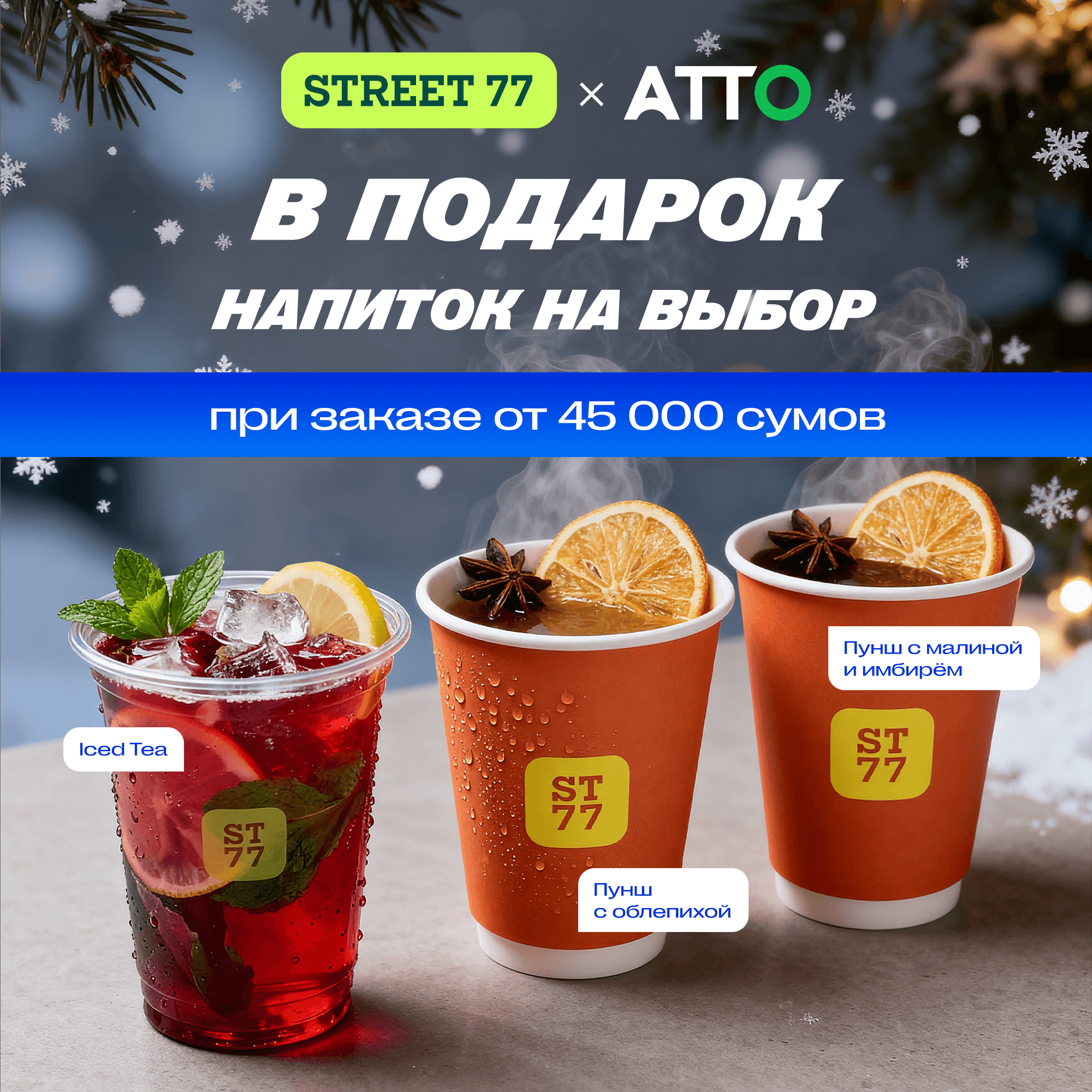 Пользователи приложения ATTO получают в подарок напиток на выбор из трёх предложенных вариантов — при заказе любых позиций в филиалах Street 77 на сумму от 45 000 сумов. Для получения напитка в подарок необходимо показать открытое приложение ATTO на кассе филиала Street 77.