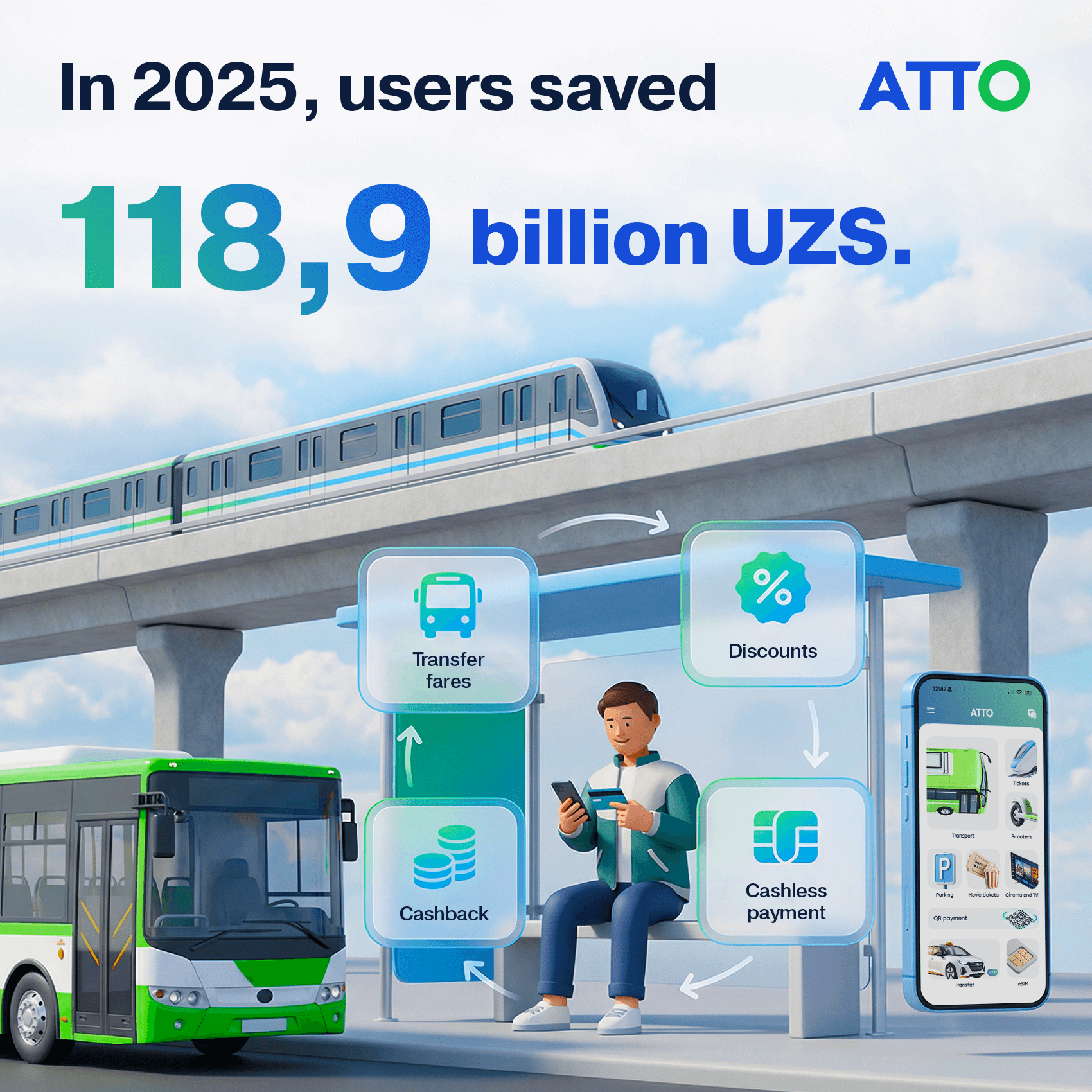 ATTO, together with its partners, implemented a number of joint campaigns offering passengers various discounts and cashbacks when paying for public transport fares. Thanks to different tariffs and bonus programs, using transport and bank cards, as well as mobile applications, has become significantly more beneficial than paying with cash. As a result, 82 billion soums were effectively returned to users through the discount system, which stimulated a mass transition to transparent cashless payments.