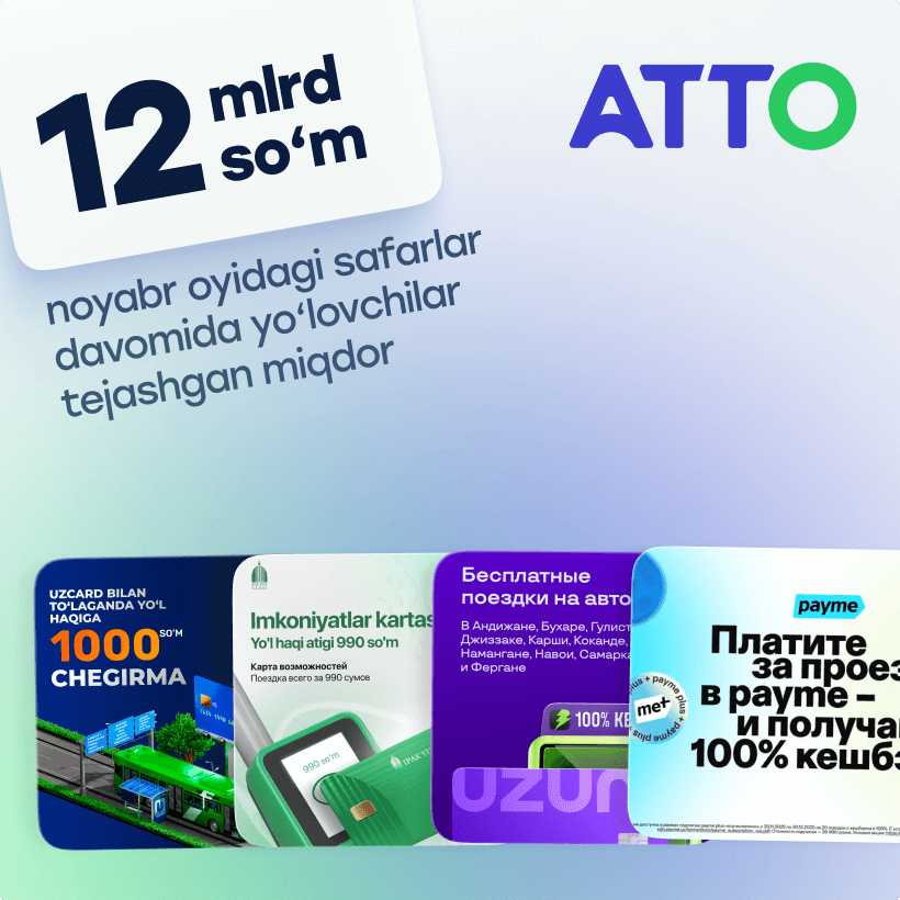 Joriy yilning noyabr oyida jamoat transporti yo‘lovchilari ATTO’ning faoliyati tufayli rekord darajadagi 12 milliard so‘m mablag‘ni tejashga muvaffaq bo‘ldi.